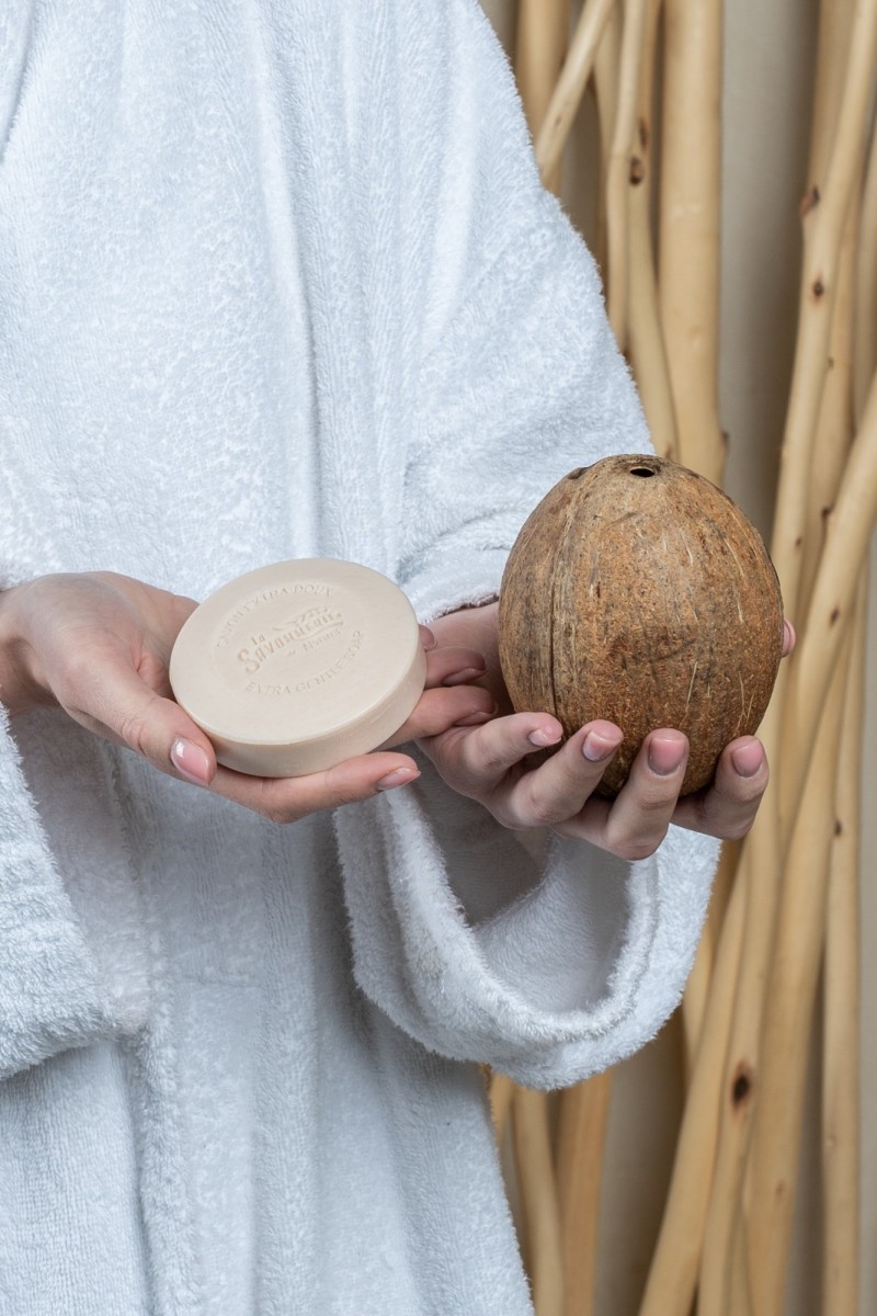 Круглое мыло с органическим кокосовым молоком содержит оливковое масло из Ньона и органическое масло ши.