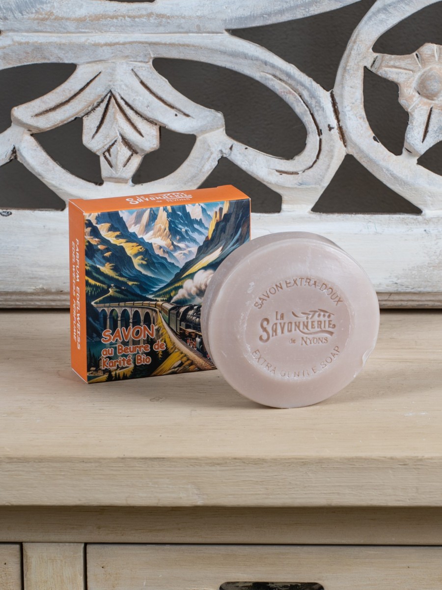 Круглое мыло с эдельвейсом в картонной коробке Поезд в горах 100 гр